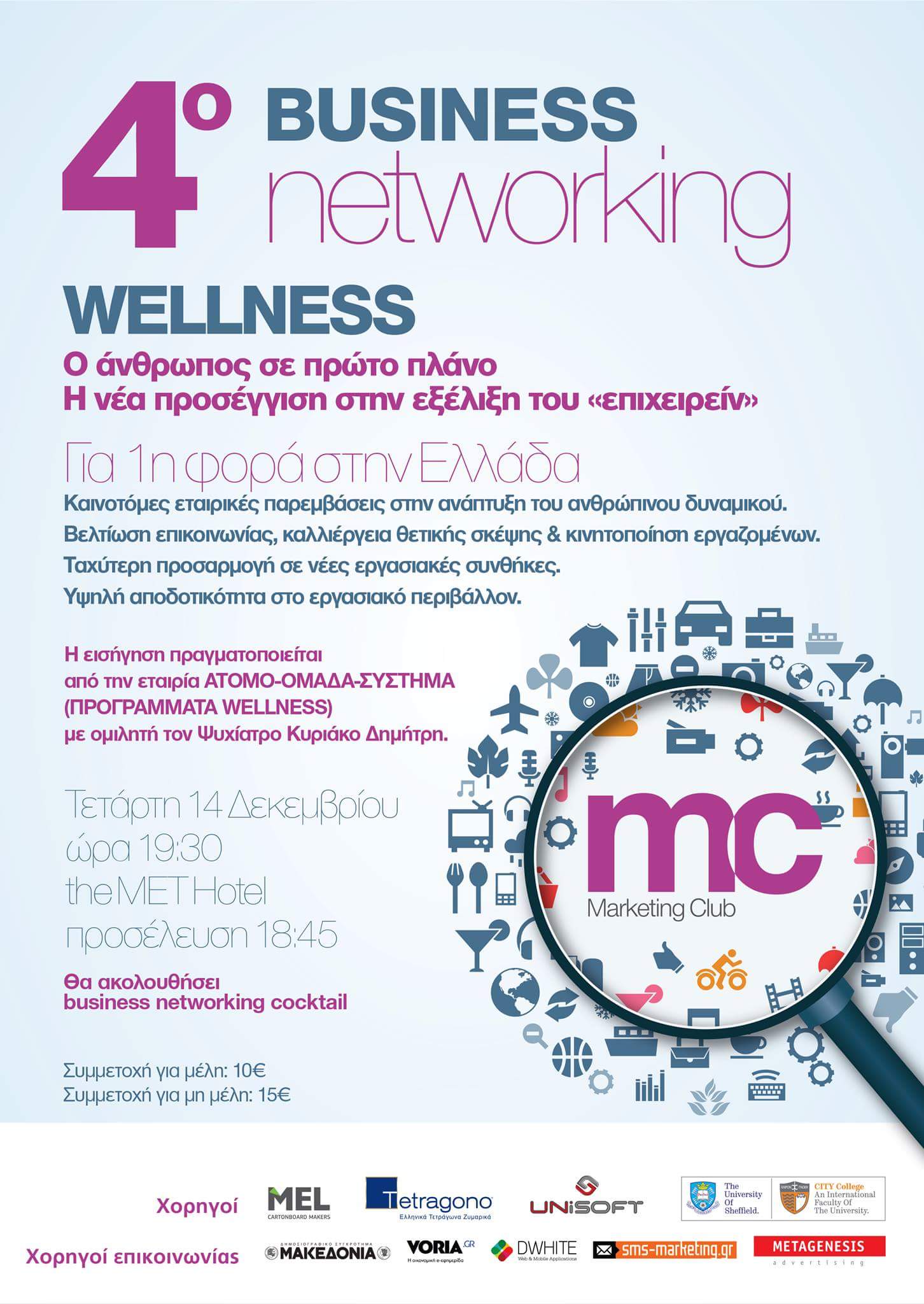 Την Τετάρτη 14 Δεκεμβρίου 2016 η εταιρία μας συμμετείχε στο 4ο Business Networking Event που διοργάνωσε το Marketing Club με θέμα «WELLNESS: Ο άνθρωπος σε πρώτο πλάνο. Η νέα προσέγγιση στην εξέλιξη του επιχειρείν» που πραγματοποιήθηκε στο the MET Hotel. Με μεγάλη μας χαρά ανταποκριθήκαμε στην πρόσκληση για να παρουσιάσουμε τις καινοτόμες εταιρικές παρεμβάσεις Wellness. Η εισήγηση έγινε από τον ψυχίατρο Δημήτρη Κυριάκο, ιδρυτικό μέλος της εταιρίας Άτομο – Ομάδα – Σύστημα με μεγάλη επιτυχία καθώς την παρακολούθησαν στελέχη marketing, επικοινωνίας και επιχειρηματίες.
